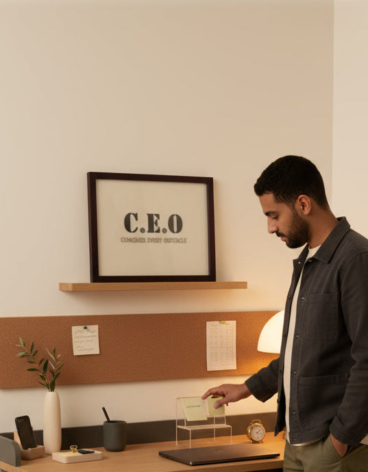 This inspiring wall art highlights the acronym "C.E.O." with a motivational twist: "CONQUER EVERY OBSTACLE." The bold, strong typography of "C.E.O." is paired with a clear and empowering message, making it a perfect addition to any workspace or home office. The design combines a classic, clean look with a modern edge, ensuring it stands out while promoting a sense of determination and success. Ideal for entrepreneurs, leaders, or anyone striving to overcome challenges, this piece serves as a daily reminder to stay focused and relentless in pursuit of goals.
