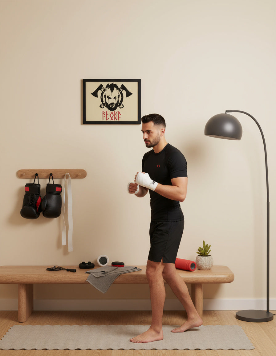 This intense and bold wall art features a fierce warrior figure, with a mohawk and beard, flanked by two crossed axes. Below the figure, the word "FLOKE" is written in striking, angular red lettering, adding to the dramatic feel of the piece. The dark, contrasting design against a neutral beige background gives the artwork an almost tribal or Viking-inspired aesthetic, evoking strength and resilience. This piece is perfect for those who appreciate a strong, rebellious style or want to infuse their space with a powerful and energetic vibe. It’s ideal for modern or industrial settings, adding a unique and impactful touch to any room.
